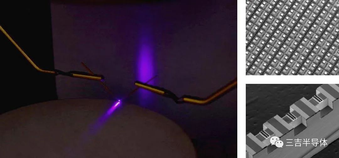 (左)此次開發(fā)的100μm長激光諧振的情形。(右上)Micro LED的放大圖。(右下)100μm長激光的諧振器的放大圖。 (出處:京瓷官網(wǎng))
