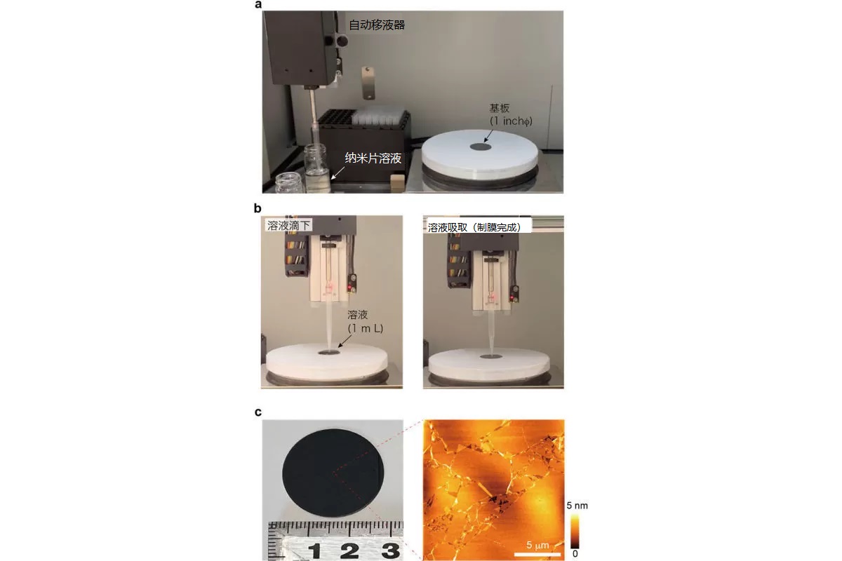 研究團(tuán)隊表示,此次的新技術(shù)不僅可以應(yīng)用于氧化物、石墨烯、氮化硼等多種組合結(jié)構(gòu)的納米片,還可以在各種形狀、尺寸、材質(zhì)的基材上成膜,是一種通用性極高的制膜技術(shù)。另外,該技術(shù)基于自動移液器進(jìn)行簡便的滴落和吸取操作,不需要專業(yè)的知識和技術(shù),一下即可完成4寸晶圓大小的大型成膜、小批量按需自動成膜等。