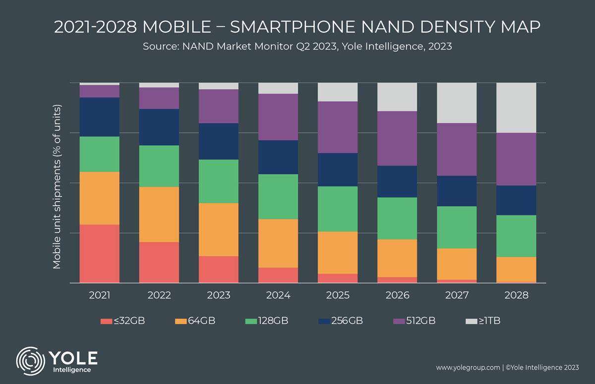 智能手機(jī)使用的NAND容量的變化推測 (出自:Yole Intelligence)