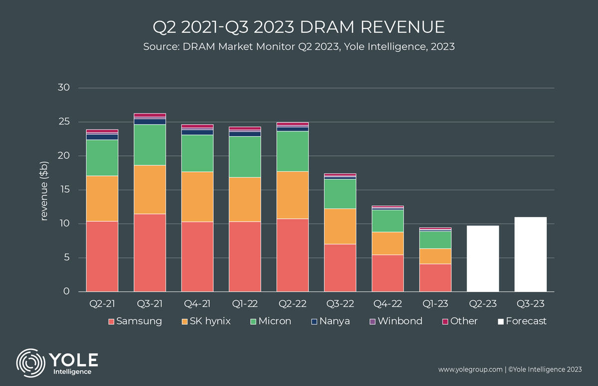 每個季度DRAM市場的總銷售額及各企業(yè)銷售額的變化 (出自:Yole Intelligence)