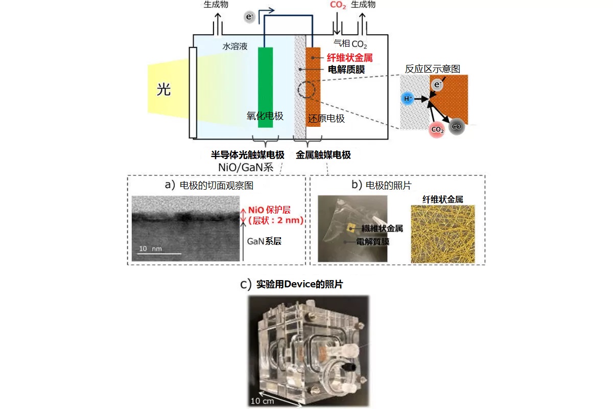 于是,NTT團(tuán)隊(duì)為了實(shí)現(xiàn)更高效地長(zhǎng)時(shí)間連續(xù)進(jìn)行氣相CO2轉(zhuǎn)換的人工光合作用,就設(shè)計(jì)開發(fā)出了這種,壽命長(zhǎng)的半導(dǎo)體光觸媒電極、與電解質(zhì)膜一體化的纖維狀金屬觸媒電極,共同組成的人工光合作用Device。以達(dá)到能夠利用太陽能和高效率轉(zhuǎn)換CO2的目的。