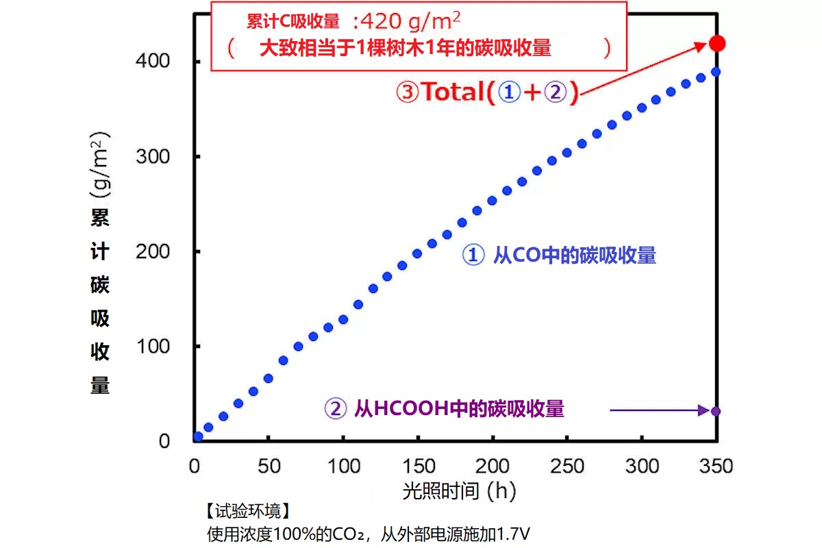 據(jù)稱,他們使用模擬陽光照射這種人工光合作用Device進(jìn)行了氣相CO2轉(zhuǎn)換實(shí)驗(yàn),結(jié)果確認(rèn)連續(xù)350小時(shí)里CO2轉(zhuǎn)換成了COHCOOH。根據(jù)生成的COHCOOH算出每單位面積的累計(jì)碳吸收量達(dá)到了420g/m2,創(chuàng)造了使用半導(dǎo)體光觸媒進(jìn)行人工光合作用連續(xù)運(yùn)作350小時(shí)的世界最長(zhǎng)紀(jì)錄。NTT還表示,此次驗(yàn)證的碳吸收量,超過了1棵杉樹1㎡約1年所吸收的碳排量。
